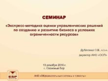 СЕМИНАР Экспресс-методика оценки управленческих решений по созданию и