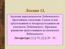 Лекция 12 Аксиома параллельности Лобачевского Простейшие следствия Сумма