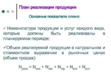 План реализации продукции Основные показатели плана ü Номенклатура
