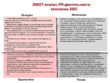 SWOT-анализ PR-деятельности компании АВС Strengths Weaknesses Устойчивое