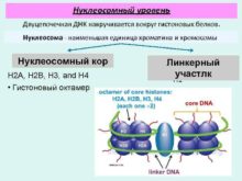 Нуклеосомный уровень Двуцепочечная ДНК накручивается вокруг гистоновых белков