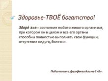 Здоровье-ТВОЁ богатство Здоро вье состояние любого живого организма