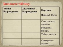 Заполните таблицу Этапы Возрождения Художники Возрождения Картины Поцелуй