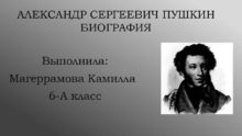 АЛЕКСАНДР СЕРГЕЕВИЧ ПУШКИН БИОГРАФИЯ Выполнила Магеррамова Камилла 6