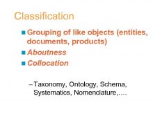 Classification n Grouping of like objects entities documents