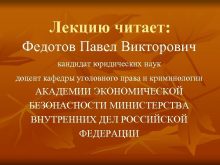 Лекцию читает Федотов Павел Викторович кандидат юридических наук