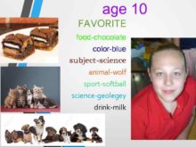 age 10 FAVORITE food-chocolate color-blue subject-science animal-wolf sport-softball