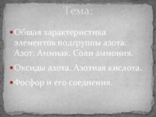 Тема Общая характеристика элементов подгруппы азота Азот Аммиак