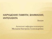 НАРУШЕНИЯ ПАМЯТИ ВНИМАНИЯ ИНТЕЛЛЕКТА Лекция Ассистент кафедры психиатрии