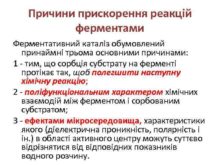 Причини прискорення реакцій ферментами Ферментативний каталіз обумовлений принаймні