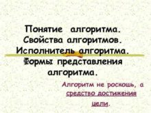 Понятие алгоритма Свойства алгоритмов Исполнитель алгоритма Формы представления