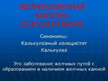 ЖЕЛЧЕКАМЕННАЯ БОЛЕЗНЬ CHOLELITHIASIS Синонимы Калькулезный холецистит Калькулез Это