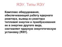 ЯЭУ Типы ЯЭУ Комплекс оборудования обеспечивающий работу ядерного