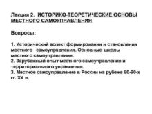 Лекция 2 ИСТОРИКО-ТЕОРЕТИЧЕСКИЕ ОСНОВЫ МЕСТНОГО САМОУПРАВЛЕНИЯ Вопросы 1