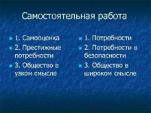 Самостоятельная работа 1 Самооценка 2 Престижные потребности 3