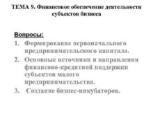 ТЕМА 9 Финансовое обеспечение деятельности субъектов бизнеса Вопросы