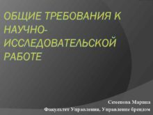 ОБЩИЕ ТРЕБОВАНИЯ К НАУЧНОИССЛЕДОВАТЕЛЬСКОЙ РАБОТЕ Семенова Марина Факультет