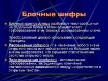 Блочные шифры Блочные криптосистемы разбивают текст сообщения на