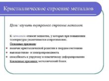 Кристаллическое строение металлов Цель изучить внутреннее строение металлов