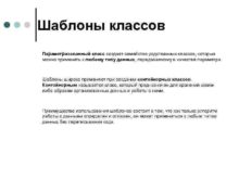 Шаблоны классов Параметризованный класс создает семейство родственных классов
