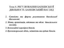 Тема 6 РЕГУЛЮВАННЯ БАНКІВСЬКОЇ ДІЯЛЬНОСТІ БАНКІВСЬКИЙ НАГЛЯД 1