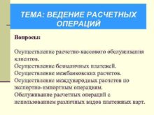 ТЕМА ВЕДЕНИЕ РАСЧЕТНЫХ ОПЕРАЦИЙ Вопросы Осуществление расчетно-кассового обслуживания