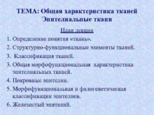 ТЕМА Общая характеристика тканей Эпителиальные ткани План лекции