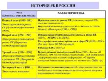 ИСТОРИЯ PR В РОССИИ ЭТАП ХРОНОЛОГИЧЕСКИЕ РАМКИ ХАРАКТЕРИСТИКА