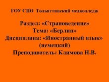 ГОУ СПО Тольяттинский медколледж Раздел Страноведение Тема Берлин
