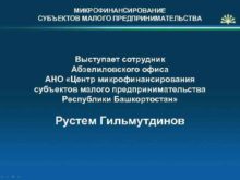 МИКРОФИНАНСИРОВАНИЕ СУБЪЕКТОВ МАЛОГО ПРЕДПРИНИМАТЕЛЬСТВА Выступает сотрудник Абзелиловского офиса