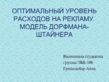 ОПТИМАЛЬНЫЙ УРОВЕНЬ РАСХОДОВ НА РЕКЛАМУ МОДЕЛЬ ДОРФМАНАШТАЙНЕРА Выполнила