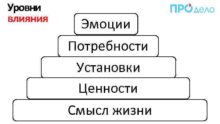 Уровни влияния Эмоции Потребности Установки Ценности Смысл жизни