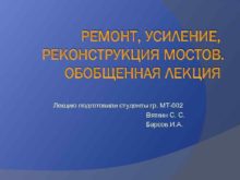 РЕМОНТ УСИЛЕНИЕ РЕКОНСТРУКЦИЯ МОСТОВ ОБОБЩЕННАЯ ЛЕКЦИЯ Лекцию подготовили