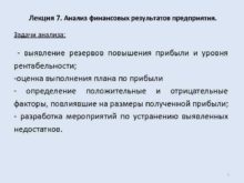 Лекция 7 Анализ финансовых результатов предприятия Задачи анализа
