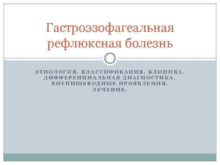 Гастроэзофагеальная рефлюксная болезнь ЭТИОЛОГИЯ КЛАССИФИКАЦИЯ КЛИНИКА ДИФФЕРЕНЦИАЛЬНАЯ ДИАГНОСТИКА