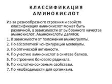 КЛАССИФИКАЦИЯ АМИНОКИСЛОТ Из-за разнообразного строения и свойств классификация