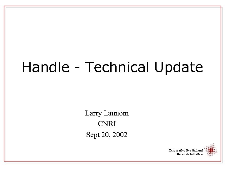 Handle — Technical Update Larry Lannom CNRI Sept