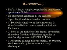 Bureaucracy Def n A large complex organization composed