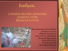 Бивуак СТРОИТЕЛЬСТВО УКРЫТИЙ ДОБЫЧА ОГНЯ ВИДЫ КОСТРОВ Презентацию