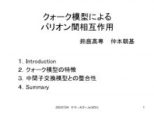 クォーク模型による バリオン間相互作用 鈴鹿高専 仲本朝基 1 Introduction 2 クォーク模型の特徴 3 中間子交換模型との整合性 4 Summary