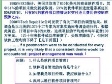 1995年SEI统计 美国共取消了810亿美元的商业软件项目 其 中 31 的项目未做完就被取消 53 的软件项目进度通常要延长 50 的时间 只有9 的软件项目能够及时交付并且费用也控制在 预算之内 2000年Tech Republic公司发表了有关IT项目的调查结果 该 调查是以北美的1375个IT专家为对象实施问卷调查进行的 根据