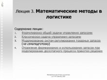 Лекция 3 Математические методы в логистике Содержание лекции