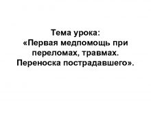 Тема урока Первая медпомощь при переломах травмах Переноска