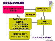 実践本部の組織 かなざわ食育プラン2007 実践本部 庁内プロジェクトチーム 局長レベル 課長レベル 政策調整会議 食育専門推進員