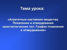 Тема урока Агрегатные состояния вещества Плавление и отвердевание