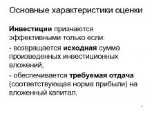 Основные характеристики оценки Инвестиции признаются эффективными только если