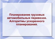 Планирование грузовых автомобильных перевозок Алгоритмы ускоренного планирования