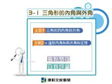 我們在國小已經學過三角形的一些性質 接著再來探討三角形的其他性質 搭配課本第 98頁 國小曾經利用量角器和剪紙拼湊的方法 知道三角形的內角和為 180
