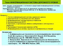 Тема ИНФОРМАЦИОННАЯ СИСТЕМА ДОРОЖНОГО УРОВНЯ Цель лекции ознакомление