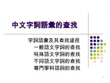 中文字詞語彙的查找 字詞語彙及其查找途徑 一般語文字詞的查找 特殊語文字詞的查找 不同語文字詞的查找 專門學科語詞的查找 1